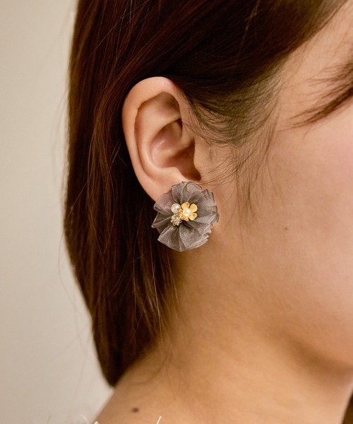 ビジューやチュールなどレディライクな要素のつまった立体的なイヤリング。【デザイン・シルエット】・ビジュー付きのチュールイヤリング。・小ぶりながら、立体的なチュールが顔周りを華やかにしてくれる。【カラー】・チャコールとキナリの2色展開。【スタイリングポイント】・普段使いからお呼ばれにも、幅広く着用可能。・ワンピースやワントーンコーデのポイント使いとしてもおすすめ。※撮影時の光、お使いのモニター環境によって色の見え方が違う場合がございます。