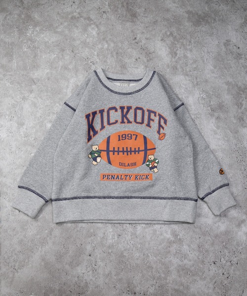 「KICK OFF」**のロゴと大きなフットボールのモチーフがデザインされた、スポーティなカレッジ風トレーナーが登場です🏈 クマのキャラクターたちも可愛らしく、遠くからでも目を引くこと間違いなし!動きやすい定番の形はアウターを着てももたつきにくい♪吸湿性・保温性に優れた裏毛仕様なので重ね着次第でロングシーズン活躍します◎ 【おすすめのコーディネート】 (ネイビー)ネイビーのトレーナーは、ライトグレーのスウェットパンツで上下をカジュアルにまとめると、即座におしゃれな**「アメカジスタイル」が完成。ロゴのグリーンを拾ってグリーンのニット帽**を合わせたり、ソックスに差し色を入れたりするとお洒落度アップ!足元はスニーカーで統一し、元気いっぱいの週末コーデに♪ (グレー)落ち着いたグレーのトレーナーを主役に、黒やカーキのチノパンツを合わせた大人顔のカジュアルコーデ。ロゴのオレンジを拾ってオレンジやキャメルのキャップを合わせると、統一感のある着こなしになります。足元にローファーなどきちんと感のあるアイテムを合わせると、遊び着だけでなくお洒落なお出かけにも使えるスタイルに格上げされます◎公園遊びや通園・通学、ちょっとしたお出かけまで、毎日を楽しくするマストバイアイテムです! *80、90サイズのみ左肩にボタンがついており、脱ぎ着がしやすくなっております。 *DILのベビーサイズ商品は、全てホルマリン含有率の検査を通っておりますのでご安心下さい。 【DILASH ディラッシュ】 こだわりの素材にトレンドをきかせた、お気に入りのデイリーカジュアルブランド。明るく元気で楽しい毎日を演出する、そんなコーディネートを提案します。