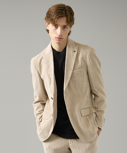 独特な素材感で魅せるドレッシーな一着【素材】 10ウェルの少し薄手で柔らかいコーデュロイ素材を採用。 裏にシャーリング糸を挿入しランダムなシワ感とストレッチ性を持たせました。 カジュアルさとドレッシーさを併せ持つ独特な素材感。 見た目以上に軽量でストレスを感じない着用感。 【デザイン】 華やかさと力強さを感じるピークドラペルジャケット。 定番シルエットより、ややウェストを絞ったスマートなシルエットです。 ストレッチ性のある裏地を採用し、動きやすさをカバー。 ポケット玉縁などに同色系レザー風カット素材を使用しアクセントにしています。 オリジナルのフラワーチャーム付き。 シックなブラックカラーで胸元を華やかさをプラスします。 【コーディネート】 同素材のスラックス(品番:00518052001)とセットアップスタイリングがおすすめ。 ビジネススタイルから結婚式やお食事会などのパーティーシーンにも合うアイテムです。