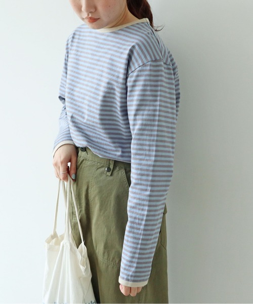 2026 spring&summer new color【yellow×ivory・blue×gray】しっかりとした生地が安心感のある、メイドインジャパンの定番ボーダーカットソーシリーズ。こちらのページはシーズンカラーの展開です。襟と袖口のバインダーがフレンチなイメージ。シャツやカーディガンとの重ね着もしやすいベーシックなシルエットですが、一枚着として着やすいよう、袖や身幅の太さ、肩の落ち感などボディラインに沿わないややゆとりを持たせたサイズ感に仕上げました。こちらのシリーズはハリのあるやや硬めの生地感ながらも、どんなシーズンにも着やすい厚みが使いやすい。マリンコーディネートには欠かせない定番のボーダーに、配色バインダーやスリット止まりのカンヌキなどちょっとしたエッセンスを加えたこだわりの一枚。デザイン性だけではなく、着用と洗濯を繰り返してもへたりにくいタフさが嬉しい、スタッフ人気も高いアイテムです。※同じ形のベーシックカラーは【5001CT011261】の品番ページでご用意しております。※同じ色展開でBIGシルエットの長袖は【5001CT008261】の品番ページでご用意しております。※同じ色展開でベーシックなシルエットの半袖は【5001CT009261】、BIGシルエットの半袖は【5001CT010261】の品番ページでご用意しております。--------------------------透け感:なし裏地:なし伸縮性:あり光沢感:なしポケット:なし--------------------------【素材の特性・お取り扱いの注意】・取り扱いの注意については取り扱い表示をよくご確認の上、着用をお願い致します。・汗や雨等でぬれた場合、摩擦などにより色落ちし、他の衣料に移染することがありますので取扱いにご注意下さい。・お洗濯の際、多少の縮みや斜行する場合がありますので、できるだけ手洗いをして形を整えてから日陰干しして下さい。タンブラー乾燥はお避け下さい。※撮影画像は、光の当たり具合やモニターの環境により色味が違って見える場合があります。あらかじめご了承ください。------------------------------------------------------【 価格改定のお知らせ 】昨今の原料や輸送コスト高騰に伴い価格改定を実施させていただくこととなりました。大変心苦しくはありますが、今後も皆様に喜んで頂ける商品をお届けできるよう努めて参ります。価格改定以前は以下の品番で販売しておりました。※仕様や素材などの変更はございません。旧ブランド品番:5001CT015241商品名:ボーダー配色バインダー カットソー-------------------------------------------------------