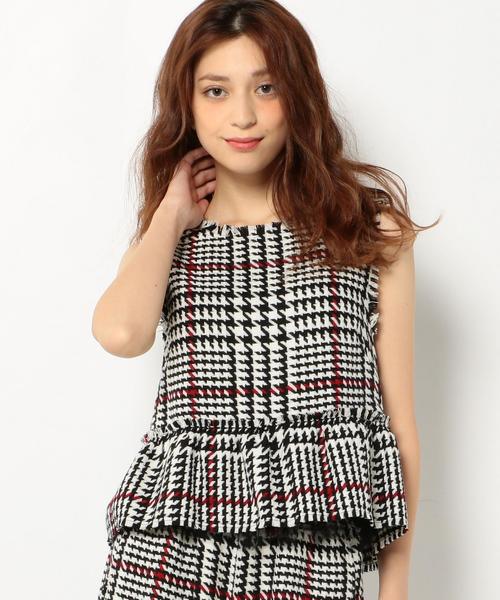 チェックペプラムノースリーブ☆ 千鳥柄ベースのざっくりとしたチェック柄が、コーディネートの主役にピッタリのトップス。 厚手のしっかりとした生地を使用していることで、ペプラム部分がふんわり♪ 内側からちょっぴりのぞくチュール使いもポイントです。 同シリーズのパンツに合わせたセットアップ風の着こなしもオススメです。 ※着用、お取り扱いの際は商品についておりますアテンションタグ、洗濯ネームを必ずご確認ください。 店舗にお問い合わせの際は、全国のAnother Edition店舗まで 下記の品名/品番をお申し付け下さい。 品名:AEFC CHK ペプラム NSL 品番:56161990434