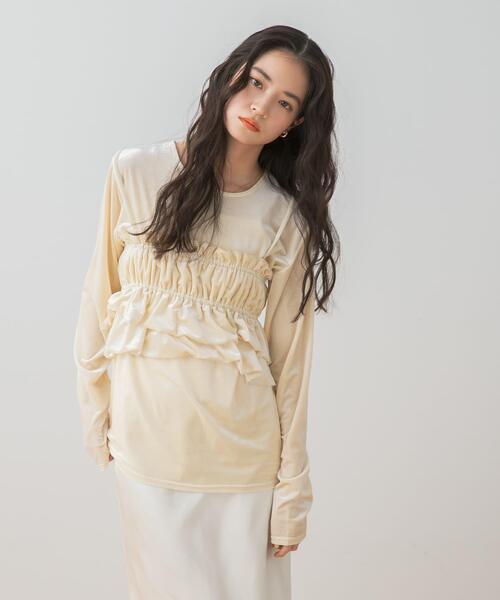 【アレンジ自在。上品ベロアの着回しトップス】・落ち感のあるベロア素材が、上品で華やかな印象・トレンド感のあるフリルビスチェをドッキングしたデザイン・ストラップを外したり腰に巻いたりなど、マルチに使えるフリルビスチェ上品な落ち感のあるベロア素材を使用したトップス。トレンドのフリルビスチェをドッキングしたようなデザインが、一枚で主役級の華やかさを演出します。フリルビスチェ部分は、ストラップを外して腰に巻くなどマルチなアレンジが可能。デニムと合わせたカジュアルダウンスタイルもおすすめです。【2025 Autumn/Winter】【25AW】※この商品は染色の特性上、着用中の摩擦や汗などにより他の衣類や下着、淡い色のベルトやカバン、ソファーなどに色移りすることがあるので、コーディネートや取り扱いにご注意ください。[ビスチェ]one : 肩幅22cm / 総丈約42cm / 身幅約33cm※商品画像は、光の当たり具合やパソコンなどの閲覧環境により、実際の色味と異なって見える場合がございます。予めご了承ください。※商品の色味の目安は、商品単体の画像をご参照ください。▼お気に入り登録のおすすめ▼お気に入り登録された商品は、マイページにて現在の価格情報や在庫状況の確認が可能です。お買い物リストの管理にぜひご利用ください。素材感透け感 : なし伸縮性 : あり裏地 : なし光沢 : ありポケット : なしone