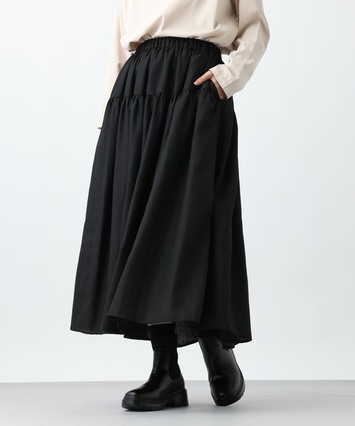 ふんわりとした女性らしいデザイン揺れ感が素敵なティアードスカートーーー【素材】ウール混を使用。ウールが入っているので、肌触りや見え感がナチュラルな雰囲気です。【デザイン】女性らしい印象のティアードスカート。ふわっとしたティアードデザインと揺れ感がコーデに甘さをプラス。ウエストはゴム仕様なので、ストレスフリーな履き心地もポイントです。ーーー【スタイリング】オーバーサイズのニットを合わせたゆるっとした着こなしがおすすめ。カジュアルアイテムとも相性が良いので、スウェット合わせも素敵に決まります。