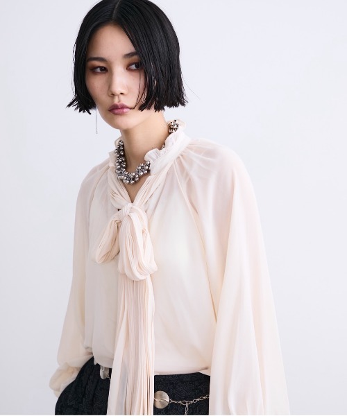 2025 AW collection▪point・上品なボウタイが顔まわりを華やかに見せてくれる、存在感抜群のボウタイシャツ。・襟元に結ぶだけで即きれいめなムードが完成する、1枚で着映えするデザイン。・リボン結び、垂らし、片結びなどアレンジ自在で、気分やシーンにあわせて雰囲気を変えられるのも魅力。・クラシカルなデザインながら、程よくゆとりのあるシルエットで今っぽい抜け感を演出。・フロントボタン仕様で着脱しやすく、ジャケットやニットのインナーとしても相性抜群。・シンプルコーデのアクセントとして、オン・オフ問わず活躍する万能シャツ。・カラーは上品なIVORY、シックに締まるBLACK、差し色にぴったりなPURPLEの3色展開です。▪styling・ミニスカートやワイドパンツと合わせて、クラシック×モードなバランスコーデに。・デニム合わせでカジュアルダウンしても、リボンが女性らしさをしっかりキープ。・ジャケットやカーディガンのインナーとして、オフィススタイルにも◎・ボウタイを垂らしてすっきり着ても、リボンにして可愛らしく仕上げてもOK。・1枚で季節問わず使えるので、デイリーから特別な日まで幅広く対応してくれる優秀アイテム。・日常のフォーマルシーンとして、オケージョンや特別なシーンにも活躍する一着。入園・卒園から卒業式のシーンにもオススメです!〈素材感〉透け感:ややあり裏地:なし伸縮性:なし光沢感:なし〜控えめ生地の厚さ:普通▼商品のお気に入り登録 ♡完売カラーの再入荷通知や、ラスト1点、セールの通知をお知らせ致します。▼ブランドお気に入り登録 新商品や再入荷など、いち早くブランドの情報を受け取ることができます。【ATTENTION】※画像の商品はサンプルです。実際の商品と色味、仕様、加工、サイズ、素材等が若干異なる場合がございます。※撮影場所やお使いのモニター環境により若干お色味が異なる場合がございます。※製品によっては染料の特性上、湿った状態や汗をかいた状態での長時間の放置、または摩擦により、他のものへ色移りする恐れがありますので、着用時にはご注意下さい。 ※お洗濯については商品の洗濯タグ表記をご確認ください。※風通しがよく、湿気の少ない日の当たらない場所で保管して下さい。 ※また製品加工上、お手元に届く際に匂いが生じる場合がありますが、 ご使用を続けていく事により匂いは軽減されます。