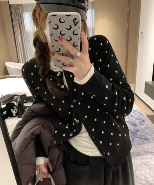 シンプルなのに存在感しっかり!ドット柄ニットカーディガン 【デザイン】 小さなドット柄が全体に散りばめられた、レトロガーリーさ漂うニットカーディガン♪ 程よくフィットするシルエットで、すっきりとした着こなしが叶います◎ コンパクトなクルーネックとウエストリブで、着るだけで上品なシルエットが完成。 ベーシックなカーディガンにトレンド感をプラスした、着回し力抜群のアイテムです。 ブラックとグレーの2色展開で、甘さと落ち着きを両立。 ガーリー派も大人カジュアル派にもおすすめの一枚です。 【素材感】 着心地が柔らかいアクリル素材 伸縮性:あり/ 透け感:なし / 裏地:なし 手洗いによる洗濯可 / ドライ・ウェットクリーニング可 【コーディネート】 タック入りのミニスカートと合わせて、ソウルっぽいガーリーカジュアルに♪ デニムパンツでさらっと合わせると大人っぽい雰囲気にも◎ ワンピースやスカートとも相性抜群! 羽織りとしてはもちろん、全部ボタンを留めてトップス風に着るのも今っぽくておすすめです。 【※お取り扱い上のご注意】 1:モニター環境等により実際の商品と多少色味が異なって表示される場合がございます。予めご了承下さい。 2:屋外で撮影された商品は、天候により多少実際のカラーと異なる場合があります。商品のカラーはトルソー(マネキン)の商品画像をご参照ください。 3:濃い色の商品は、お洗濯や摩擦等による移染にご注意ください。 4:末永くご愛用頂く為に、アテンションタグ・洗濯ネームを必ずご確認の上、着用又はお取り扱い下さい。 5:生産時期により、色、サイズ、デザイン、素材の質感が多少が異なる場合がございます。あらかじめ御了承下さいませ。