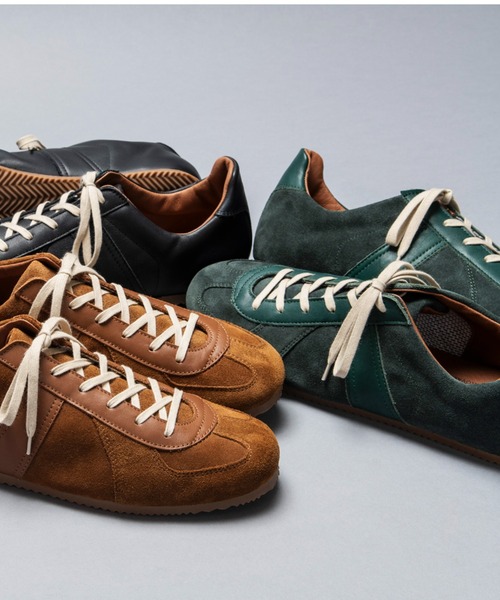 pen 25年11月号掲載 MonoMax 25年11月号掲載 25AW GERMAN MILITARY TRAINER THIN FLAT SOLE仕様のモディファイドモデル。 1980年代にかけてドイツ軍でトレーニングシューズとして採用されていたスニーカーの通称《ジャーマントレーナー》。 つま先保護で付けられたスエードが今やデザインとして確立されているキングオブミリタリースニーカーです。 アッパーは、上質なイタリアンスエードレザーとイタリアンフルグレインレザー、ライニングとインソールは、ピッグレザーを使用。 薄く仕上げたフラットラバーソールは軽量で柔軟な履き心地を感じさせます。 【REPRODUCTION OF FOUND/リプロダクションオブファウンド】 見つけ出す:FOUND、再現する:REPRODUCTIONをコンセプトに2016SSよりスタートしたブランド。 ミリタリーシューズシリーズは1950年代~1970年代にかけて数多くの軍用トレーニングシューズを生産していたスロバキアのファクトリーで、ひとつひとつ丁寧にハンドメイドで生産されています。 ロゴやタグには品名、国名、年代を記載しデザインソースを明かしています。 ミリタリーアイテムを中心に時代を超えた普遍的なアイテムを見つけ出し、現代的に再現させてリリースしています。