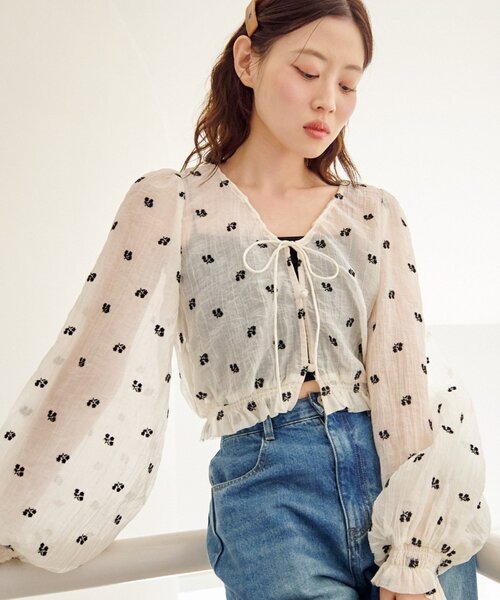 軽さが魅力のフェミニンブラウス■デザイン繊細なフラワーステッチが目を惹く、透明感たっぷりのフロントリボンブラウス。軽やかなシアー素材にふんわりボリューム袖を合わせ、着るだけで柔らかい雰囲気に仕上がります。裾はきゅっと寄せたペプラムデザインで、スタイルアップしながらガーリーさもプラス。デニムやスカートなど、幅広いボトムと相性の良い着回し力の高い一枚です。■生地感袖はふわっと広がる軽量ボリューム生地。全体的に柔らかくて、肌あたりも優しい質感。***********************洗濯方法:手洗い可能裏地:なし透け感:ややあり伸縮性:なし光沢感:なし生地の厚さ:やや薄い***********************■スタイリングデニムと合わせて、甘さを程よく引いたカジュアルコーデに。ショートパンツ×ブーツでガーリーに寄せたバランスコーデ。カラーキャミをのぞかせてコーデにアクセントをつける着こなしも◎。▼おすすめスタイリングコーデュロイショートパンツカーブステッチデニムシャギーラメニットショートパンツ【お取り扱いの注意】※着用時、洗濯時は必ず取り扱い表示・タグをご確認の上、お取り扱いください。※サイズ採寸は各モールによって異なり、多少の誤差が生じる可能性がありますのでご了承ください。※商品画像はサンプル品を使用しているため、実際の商品と仕様、加工、サイズが若干異なる場合がございます。また、可能な限り実物に近いカラーにて掲載していますが、使用しているパソコンのモニター設定や、携帯電話のメーカー・機種により実際のカラーと異なって見える場合がございます。予めご了承ください。▼商品のお気に入り登録ハートマークをクリックし、お好きなカラーを選んでお気に入りに登録完売カラーの再入荷通知や、ラスト1点の通知、セールの通知も受け取ることができます。▼ブランドのお気に入り登録新商品や再入荷等、いち早くブランドのお得な情報を受け取ることができます。<返品・キャンセルについて>・着用・洗濯後の返品・ご交換は致しかねます。・商品到着後、着用前に商品を確認して頂きますようお願い致します。