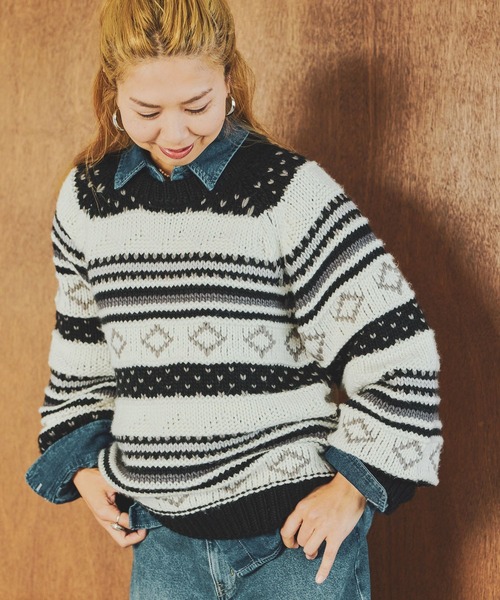 『CLIP BY STAFF』JUN企画!大人も着やすいジャガード柄のニットプルオーバーーーー【素材】軽くて柔らかい糸を使用。チクチクせず着心地が良いのも特徴です。【デザイン】古着のニットからモディファイしたレトロジャガード柄ニット。ランダムに施されたボーダー柄が特徴的な一枚です。お袖は程よいボリューム感に、身頃はあえて少しコンパクトに仕上げることで上半身が大きく見えないように工夫しています◎レトロな雰囲気もありつつ大人も着用しやすい柄ニットに。トップス ニット ジャガード レトローーー【スタイリング】パンツにもスカートにも合う一枚。程よくボリュームが出るのでボトムスはストレートパンツやナロースカートなどすっきりとしたものがおすすめ。インナーにシアーカットソーなどを合わせていただくと、トレンド感のある着こなしが完成します。▼スタッフコメントレトロ感のある柄と配色に拘ったニットを作りました!シンプルなコーディネートに+1するだけで雰囲気が出てスタイリングが完成します。あえてアーム部分をふんわりしたシルエットにして重ね着もしやすいデザインにしているのでインナーとのコーディネートも楽しんでいただけたらうれしいです◎