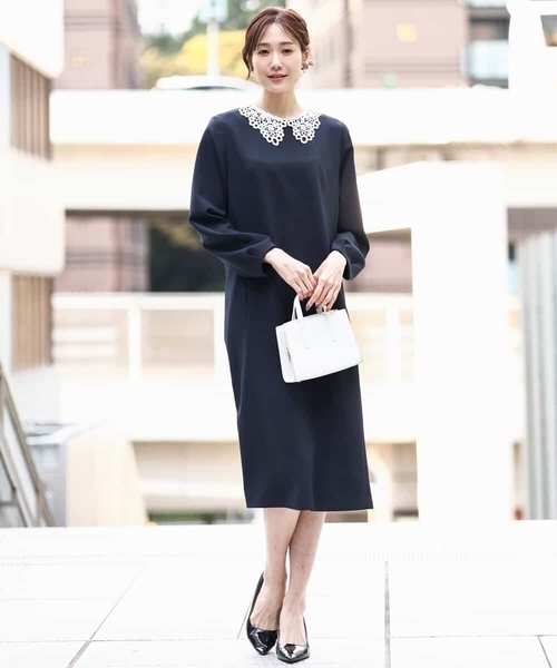 取り外し可能なレース衿付きで、雰囲気を変えた着こなしを楽しんで ■デザイン ホワイトのレース衿がアクセントのワンピース。レースは取り外し可能なデザインで、衿を外すとシンプルなサックワンピースとして着用できます。シルエットは程よくゆとりがあり、体のラインを拾いにくいサイズ感に仕上げています。 ■素材 シワになりにくくお手入れもラクなきれい見え素材を使用。なめらかな表面感と程よい光沢感が魅力の素材はシーズン関係なく着用しやすい素材感です。動きやすいストレッチ感とお仕事にも嬉しい防シワ機能付き。 ■コーディネート レディライクで大人可愛い印象のワンピースは、華やかさのほしい卒業式や入学式のセレモニーシーンにもおすすめ。衿を取り外せば、全く違った雰囲気で楽しめるので、普段使いにも取り入れやすく、トレンド関係なく長く着用いただけます。 -------------------- 着用シーズン 春:◎ 夏:× 秋:◎ 冬:◎ -------------------- 洗濯表示:手洗い可 透け感:なし 裏地:あり 伸縮性:あり 生地の厚さ:ふつう -------------------- 【スタッフ着用コメント】 [STAFF K] 身長:150cm/普段サイズ:36/着用サイズ:38 身長150㎝でくるぶし上5センチほど。ぺたんこ靴でも大丈夫そうです。袖にタックが入っているので低身長の方でも手の甲にかからない袖丈でした。襟レースが子供っぽく見えるかと心配しましたが、レースがそこまで大きくないので上品に着用出来ました。お子さんのお受験や授業参観にピッタリだと思います。レースありだとネックレスなし、レースなしだとネックレスをして調節するとバランスが取れると思います。 --------------------#卒業式 #卒園式 #入学式 #入園式 #フォーマル #オフィス #ネイビーワンピ ※自然光・照明の関係、パソコン・スマートフォンなどの環境により、実際と色味が違って見える場合がございます。予めご了承ください。商品の色味は、詳細画像をご参照ください。 ※サンプルでの撮影となるため、実際にお届けする商品と仕様やサイズが異なる場合がございます。 -------------------- ■気になるアイテムは『お気に入り登録』が便利! 1.ラスト1点や再入荷の通知を受け取ることができます。 2.登録した商品だけが対象となる、あなただけのタイムセールが開催されます。 3.マイページの一覧からお気に入りをまとめて確認でき、自分だけの欲しいものリストがつくれます。