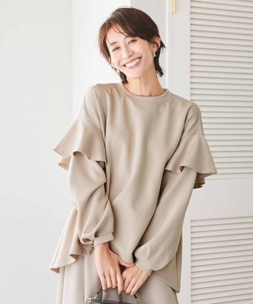 スウェットの気軽さにフェミニンなフレアーで、華やぎをプラス 肩先でひらりと揺れるフレアーが愛らしい、ダンボール素材のデザイントップス。 上品な表面感なのにのびやかな着心地に、すっきり見えるAラインシルエット、後ろ下がりのヘムラインで気になる腰まわりもカバー。 女性らしく上品に、スウェットスタイルを満喫できます。 ※フェリシモの商品には、紐などでくくられている紙タグは付属しておりません。