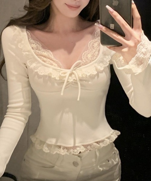 ◆DETAIL◇シアー素材×レース、リボンデザインが可愛いリブトップス。春服・夏服にぴったりの軽やか素材で、透け感とリボンが華やかさをプラス。フィット感のあるリブ素材でシルエットがきれいに出て、トップスインもアウトも使いやすい。甘めフェミニンから大人きれいめまで幅広くコーデ可能な万能トップスです。◆COORDINATE◇①【ガーリー】フレアスカート×バレエシューズで春服コーデ。レースとリボンが主役なので、ボトムスはシンプルにまとめると◎②【きれいめ】テーパードパンツ×ローファーで大人っぽく。レースとリボンで甘さを残しつつ、落ち着いたボトムで上品に。③【フェミカジ】ショートパンツ×スニーカーでラフに着こなし。甘めトップス×カジュアルボトムでバランス良く、こなれ感をプラス。【色展開】・アイボリー・ブラック◆着用レビュー◇【スタッフA:身長155cm 骨格ウェーブ S着用】シアーとレースの透け感が可愛く、低身長でもバランス良く着られました。リブ素材なのでフィット感があり、トップスインもしやすい。春服・夏服にぴったりで、歩くたびに華やかさが出る1枚です。【スタッフB:身長162cm 骨格ナチュラル M着用】ナチュラルでも窮屈感なく着られ、丈は腰骨くらいで安心。透け感とリボンでシンプルコーデでも華やかに。春夏服のデイリーコーデやお出かけにも最適です。◆POINT◇・シアー×レースで華やか見え・リボンデザインで甘さUP・リブ素材でシルエットがきれい・春服・夏服に使いやすい軽やか素材・トップスインでもアウトでもコーデしやすい・甘めフェミニンから大人きれいめまで対応◆キーワード・シアートップス・レース・リボントップス・リブトップス・春服・夏服・春夏服・甘めフェミニン・大人きれいめ・デイリーコーデ・華やかトップス※生産の特性上、商品画像との色差が多少出る場合がありますのでご了承ください※着用身長によって画像イメージと異なる場合があります。 ※撮影環境により、実際のカラー、形状、デザイン等多少異なる場合がございます。 《 お知らせ 》 ▼商品のお気に入り登録 お気に入りアイテムの値下げ・再入荷・在庫1点などの通知を受け取ることができます。 ▼ブランドのお気に入り登録 新商品や再入荷、セール、クーポン配布などお得な情報を受け取ることができます。是非、お気に入り登録してみてください!※他のキャンペーンにより、期間中に価格が変動する場合があります。※セールは予告なく終了させていただく場合もあります。※ご注文いただいた予約商品のお届け時期の確認は、注文履歴ページより行えます。※ご注文いただいた予約商品のお届け時期の確認は、注文履歴ページより行えます。