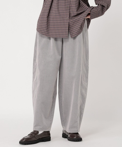 今年らしいゆるっとしたシルエット幅広いスタイリングが楽しめるコーデュロイパンツーーー【素材】柔らかなコーデュロイ素材を使用。先染めのコーデュロイなので生地自体に奥行きがあり、陰影がついた素材。柔らかいカラーがカジュアル過ぎず優しい印象です。【デザイン】柔らかなコーデュロイ素材を使用したフォルムのあるパンツ。サイドの切り替えがデザインポイントで、タック無しのすっきりフロントが◎ウエストはフロントはフラットで、バックはゴム仕様、内紐で調節可能です。裾に向かって緩くカーブになった今年らしいシルエットもポイント。ーーー【スタイリング】シャツやスウェットと合わせた思い切りカジュアルな着こなしはもちろん、ニットや甘めブラウスと合わせたMIXスタイリングもおすすめ。同素材の『品番:588453 先染めコーデュロイジャケット』と合わせたセットアップでの着こなしも素敵に決まります。