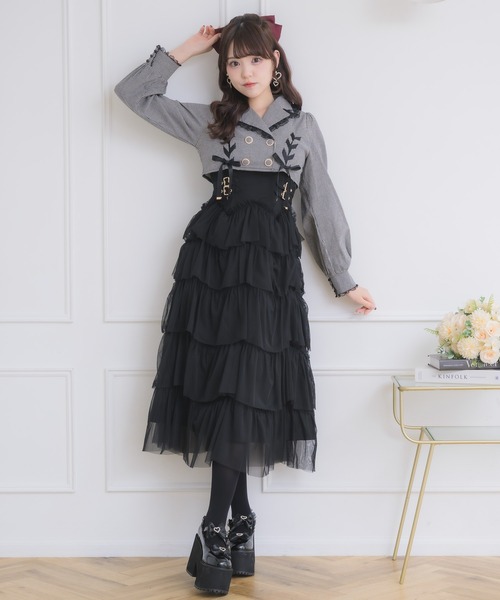 ♡ROJITA 2025 AW collection♡♥Designショートテーラードジャケットとチュールロングスカートを組み合わせたようなドッキングワンピース♪ジャケットデザイン&上品な素材感がクラス感を演出し、大人可愛いスタイルに仕上げてくれます♡チュールスカートの透け感と軽やかな揺れ感がフェミニンさをプラスし、特別なシーンやお出かけにもぴったりです。♥Stylingショート丈からロング丈までどんな丈のアウターともチュールスカートが相性良くスタイリングできます♪商品のお気に入り登録♪ 完売カラーの再入荷通知や、ラスト1点の通知、セールの通知など商品の情報をいち早くGETできます♪ ブランドのお気に入り登録♪新商品や再入荷等、いち早くブランドのお得な情報をGETできます♪ 照明の関係で、実際のお色味と若干異なる場合がございます。予めご了承ください