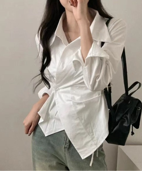 ■DETAIL シャープな襟元とアシンメトリーなカシュクールデザインが特徴のデザインブラウスです。 さらさらしていてツヤとハリのある上品なコットン素材を使用し、クリーンで洗練された印象を与えます。 ウエスト部分のドレープとタックが女性らしい立体的なシルエットを作り出し、裾は斜めにカッティングされたイレギュラーヘムで、着こなしに動きとモードなアクセントを加えます。 手首を見せて華奢な印象にしたり、ラフにロールアップしたりとアレンジも可能です。 ダブルジャケットのようなデザインは一枚で着映えし、オフィスからカジュアルまで幅広いシーンで活躍します。 ■COORDINATE ・テーパードパンツやスラックスに合わせて、洗練されたきれいめオフィススタイルに ・デニムパンツやチノパンに合わせて、カジュアルダウンした大人リラックススタイル ・タイトスカートやペンシルスカートに合わせて、女性らしいメリハリのある着こなし ・ハイウエストボトムスにインせずそのまま着て、アシンメトリーな裾デザインを活かしたスタイリング ーーーーーーーーーーーーーーーーーーーーーーー 【色展開】ホワイト(無地)/ブルー(ストライプ柄) ーーーーーーーーーーーーーーーーーーーーーーー <着用レビュー> 【スタッフA 154cm/42kg/骨格ウェーブ】 M:ウエスト周りがすっきり見えるデザインで、スタイルアップ効果が抜群です。 袖をまくって抜け感を出すと、よりバランス良く着られます。ボリュームのあるフレアスカートと合わせて、フェミニンに着こなしたいです! 【スタッフB 160cm/49kg/骨格ストレート】 L:きれいめな素材感とデザインで、通勤着としても活躍しそうです。 カシュクールのVネックが顔周りをシャープに見せてくれます。 黒のスキニーパンツとヒールパンプスで、シンプルながらもエッジの効いたモード風のコーディネートを楽しみたいです。 【スタッフC 170cm/57kg/骨格ナチュラル】 L:丈感がお尻にかかるくらいで、安心感があります。体のラインを拾いすぎないため、リラックスして着られます。 ワイドパンツやロング丈のスカートなど、ゆったりとしたボトムスと合わせても、デザイン性があるのでだらしなく見えません。 ▼POINT ・トップス ・シャツ ・ブラウス ・ダブル ・ストライプ ・柄シャツ ・レギュラーカラー ・オープンカラー ・韓国っぽ ブラウス ・カシュクール ・きれいめ ・オフィスカジュアル ・アシンメトリー ・デザインシャツ ・デザインブラウス ・長袖 ・変形シャツ ・イレギュラーヘム ・韓国ファッション ・モードカジュアル ・春コーデ ・春服 ・26年SS ・26SS ▼商品について▼ ※着用身長によって画像イメージと異なる場合があります。 ※画像の商品はサンプルとなります。実際の商品と色味、仕様、加工、サイズ、素材等が若干異なる場合がございます。 ※商品の色味は、撮影場所や光あたり具合、お使いの端末により色味が違って見える場合がございます 。予めご了承の上ご注文下さい。 ▼お取り扱いについて▼ ※着用またはお取り扱いの際は、アテンションタグや洗濯ネームを必ずご確認ください。 ※濃いカラーの商品は素材の特性上、汗や水による色移り、色落ちの可能性がございます。 ※明るい色の下着やバッグ、その他アイテムとの摩擦、色移りにご注意ください。 《 お知らせ 》 ▼商品のお気に入り登録 お気に入りアイテムの値下げ・再入荷・在庫1点などの通知を受け取ることができます。 ▼ブランドのお気に入り登録 新商品や再入荷、セール、クーポン配布などお得な情報を受け取ることができます。