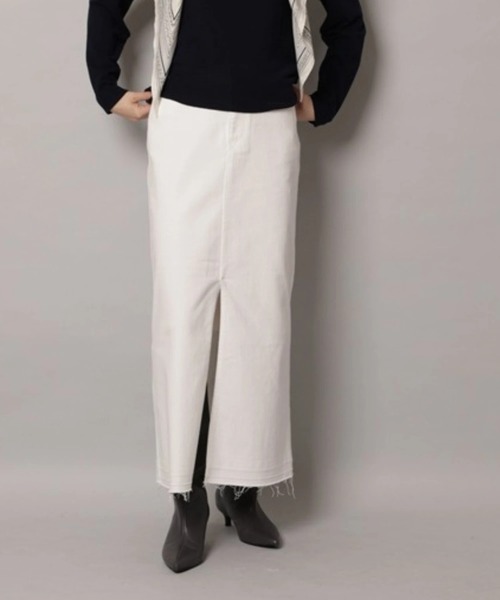 程よいハリ感のあるデニムをタイトシルエットに仕上げたタイトスカート。フロントスリットが足さばきをよくしつつ、縦ラインを強調してすっきりと見せてくれます。ニット合わせで大人カジュアルに、シャツを合わせればきれいめな印象にも。季節を問わず使いやすく、デイリーコーデの定番として活躍する万能スカートです。【ご注意】※撮影照明の関係により、実際の商品と色味が異なって見える場合がございます。また、パソコン・スマートフォンなどの環境により、製品と画像のカラーが異なる場合もございます。予めご了承ください。※商品画像はサンプルのため、色味やサイズ等の仕様に変更がある場合がございますので、予めご了承ください。