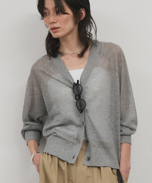 毎年人気のシアーVネックカーディガンが今年も登場。軽やかなラメ感と涼しい着心地で、夏のUV対策や冷房対策に頼れるサマーニットカーディガン■デザイン/シルエット バランスの良い着丈とラグランスリーブで、腕まわりにゆとりを持たせたサマーニットカーディガン。 深めVネックが顔まわりをすっきりと見せ、軽やかな着心地とシワになりにくい素材で持ち運びにも便利。 冷房対策や紫外線対策にも重宝します。 ※商品番号:SHK35170と同型・同素材です。 ■素材 ラメ糸を繊細に編み上げたハイゲージニットを使用。 程よい光沢感で上品見えしつつ、チクチクしない柔らかな肌触り。 さらりとした風合いで真夏まで快適に着用でき、自宅でのケアも簡単です。 ■コーディネート ノースリーブワンピースやタンクトップに羽織れば華やかさをプラス。 カジュアルなデニムやショートパンツ、きれいめスカートとの相性も抜群。 夏のワードローブに欠かせない万能カーディガンです。 ■モデル身長:166cm 着用サイズ:F ----------------------------- 光沢感:あり 透け感:あり ポケット:なし 伸縮性:あり 生地の厚さ:薄手 -----------------------------