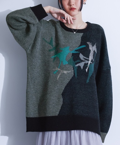 色と箔のコントラストで魅せる、アートな一枚 – Design – ジャカード編みで表現したアート柄の上に、箔プリントを施したデザインニット。 身頃の中心で歪なラインに切り替えを入れ、袖を含めた左右でカラーを変えたこだわりの仕様です。 柄は柔らかな曲線で描かれており、モードなカラーながらも強すぎない印象。 幅広いスタイルに取り入れやすい一着に仕上げました。 – Styling – 存在感のあるデザインニットです。 シンプルなボトムスを合わせるだけでお洒落に差のつくスタイリングが完成します。 – Fabric – アクリル糸を使用し、厚すぎない適度な生地感で、冬の着用に最適な仕上がりです。 – Attention – ニット製品につきまして。 ニット素材の持つ特性として編み上げる行程やプレス仕上げによって多少サイズや風合いの個体差が生じる場合がございます。 着用した時と実寸の長さが変わる可能性がございます。 また、着用の際ピリングが避けられず、完全に防止することはできません。 毛玉取り器等で丁寧に取り除いてください。 プリントは永久的なものではなく、着用時やお取り扱い時に揉まれたり、擦られたりするとひび割れて剥離しやすくなります。 保管の際は、プリント部分に他のものが触れないように注意してください。 プリント部分に直接アイロンをあてないでください。 ご了承の上、ご購入いただきますようお願いいたします。 – Size – 着丈:68cm 裄丈:80cm 袖口周り:20cm バスト:128cm 裾周り:128cm ....................................................................................... kOhAKU 憧れを日常に。自由にまとうモード服。 着る人の個性とデザインを融合し、 スタイリングで広がる可能性を提案 .......................................................................................