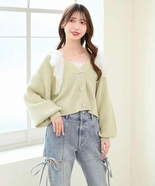 キラキラビジューにときめく♪万能カーディガン■デザインビジューボタンがポイントになった、上品ショートカーディガン。キラキラのリボンモチーフがコーディネートを品よく華やかな印象に導きます。種類の違うボタンを並べることでより煌びやかなムードに仕上げました。羽織としてはもちろんのこと、ボタンを閉めた状態でトップス感覚で使っても◎華やかなカラーバリエーションも魅力♪いつものスタイリングをパッと明るく見せてくれる万能な一着です。■サイズ感ゆとりのあるサイズ感で中にも着込みやすくなっています。着丈は低身長さんや小柄な方もスタイリングのバランスがとりやすいショート丈です。#低身長#小柄※ネックポイントからの着丈:45cm■スタイリングフレアスカートやワンピースと合わせた上品フェミニンスタイルがおすすめです。デニム合わせの大人カジュアルスタイルも◎・・・・・・・・・・・・・・・・・・・・・・透け感:なし裏地:なし伸縮性:あり光沢感:なし生地の厚さ:普通・・・・・・・・・・・・・・・・・・・・・・■商品のお気に入り登録:再入荷通知やのこりわずか、お得なプライスダウンの情報も受け取ることができます。ぜひご登録ください◎※サンプルでの撮影の為、製品と仕様が異なる場合がございます。※商品の色味は、撮影場所や光のあたり具合などにより色味が違って見える場合がございます。また、お客様のお使いのモニター環境などにより色味が異なって見える場合がございます。予めご了承の上ご注文下さい。