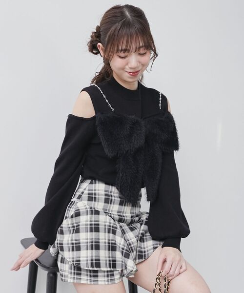 ふわふわのビッグリボンが目を惹く、映え間違いなしの主役級ニット♪■デザインフロントにあしらった、ふわふわシャギーリボンデザインが1枚で華やかさと上品さを演出。すっきりとしたプチハイネック×ヘルシーな肩開きデザインで抜け感もプラスしてくれます。取り外し可能な繊細なチェーンがアクセントとなり、より華やかな印象に。■サイズ感程よく身体にフィットするサイズ感。伸縮性があるので着心地抜群です。セットインできる丈です。■スタイリングシンプルなスカート合わせでもこのニットを着るだけで映えること間違いなしの主役級ニット♪デニムやスラックスでカジュアルダウン、フレアスカートやタイトスカートでフェミニンに、アウターの中に着ても、リボンがちらっと見えるスタイリングが楽しめます。・・・・・・・・・・・・・・・・・・・・・・透け感:なし裏地:なし伸縮性:あり光沢感:なし生地の厚さ:普通・・・・・・・・・・・・・・・・・・・・・・■商品のお気に入り登録:再入荷通知やのこりわずか、お得なプライスダウンの情報も受け取ることができます。ぜひご登録ください◎※サンプルでの撮影の為、製品と仕様が異なる場合がございます。※商品の色味は、撮影場所や光のあたり具合などにより色味が違って見える場合がございます。また、お客様のお使いのモニター環境などにより色味が異なって見える場合がございます。予めご了承の上ご注文下さい。