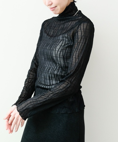 ウェーブプリーツが印象的、軽やかなシアーハイネックプルオーバー 【Material】 伸縮性のあるシアー素材を使用。 程よい透け感としなやかな風合いが特徴で、軽くさらりとした肌触りです。 【Design】 全体に施されたウェーブ状のプリーツが華やかさと立体感をプラス。 ほどよい透け感が女性らしさを引き立て、インナーとしても1枚着としても映えます。 ミニマルなシルエットで、どんなアイテムにも合わせやすい仕上がりです。 【Size】 身体に程よくフィットする細身のシルエット。 ヒップにかからないすっきりとした丈感です。 【Styling Point】 キャミワンピースやベストとのレイヤードはもちろん、ジャケットやカーディガンのインナーにも。テイストを問わず、今の着こなしに自然に馴染みます。 1枚あれば万能に使えること間違いなし。 【商品特性】 透け感:あり 裏地:なし 伸縮性:なし 光沢感:なし 生地の厚さ:薄め ▼お気に入り登録 アイテムをお気に入り登録・・・再入荷やラスト1点、セールなどの情報をお知らせします! ブランドをお気に入り登録・・・新作や販売開始のお知らせを受け取れます! ※撮影時の光の加減やご使用の端末により、実際の色味と異なる場合がございます。あらかじめご了承くださいませ。