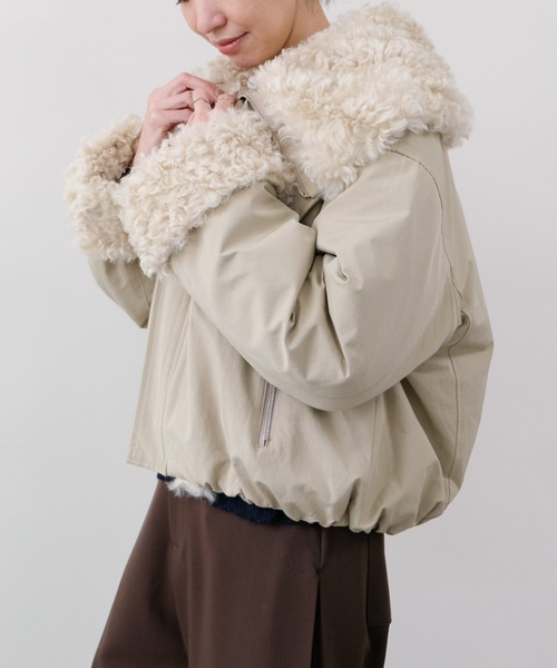 マットな質感とボリュームボアのコントラストが際立つショートブルゾン 【Material】マットな風合いとほどよいハリ感のある高密度素材を使用。 裏側は総ボア仕様で、柔らかく包み込むような暖かさが魅力です。 【Design】 ボリュームのあるショールカラー風の衿が印象的なデザイン。 フロントを閉めるとスタンドカラーのように立ち上がり、開けるとボアがのぞく抜け感のある表情に。 コンパクトな丈感でバランスが取りやすく、重心を上げてスタイルアップ効果も狙えます。 【Size 】 全体にゆとりをもたせたリラックスシルエット。 厚手のニットの上からも羽織りやすく、ボリューム感のあるバランスで旬なシルエットを演出します。 【Styling Point】 デニムに合わせてカジュアルに、スカートに合わせてフェミニンに。 衿の開き具合で印象を変えられ、着こなしの幅が広い1枚。 素材感とボアのボリュームが映える、冬の主役級アウターです。 ___________________________ ★商品のお気に入り登録 完売カラーの再入荷通知や、ラスト1点の通知、セールの通知も受け取ることができます。 是非ブランドの"お気に入り登録"もご一緒にお願いいたします。 ※画像の商品は光の反射や角度により、実物と色味が異なる場合がございます。 また、表示のサイズ感と実物は若干異なる場合もございますので、予めご了承ください。 ※着用、お取り扱いの際は、商品についている品質表示とアテンションタグを必ずご確認ください。 -DOLLUPOOPS | ドールアップウップス- 【Add a little essence】ライフスタイルの多様化が進む現代変わり続ける今をとらえ、 自分らしい感性を大切にする女性に向けて " より美しく" 毎日を" 彩る" ワードローブを。 日常に調和しつつ、" 普通 " に少しだけエッセンスをたして、他にない特別な一品を提案します。 -Instagram- 公式インスタグラム【dollupoops.tevalt_official】 ※商品のサイズ感やご質問は【dollupoops.tevalt_official】のインスタアカウントDMにて承っております。 お気軽にご相談くださいませ。