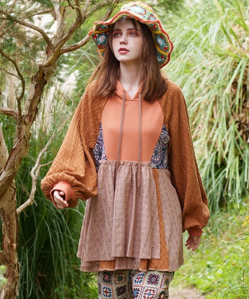 様々な異素材を組み合わせた、フォークロア調の切替デザインが個性的な裏毛フードトップス。 古着ライクなレトロな雰囲気で、唯一無二のカジュアルコーデに◎ ※こちらの商品は1点1点職人による手作りとなります。その為、生地の取り方により柄の配置や形・色合いなど若干個体差がございます。(画像は一例です。)あらかじめご了承ください。※屋外での撮影画像は、光の当たり具合で色味・カラーが違って見える場合がございます。商品のカラーは、スタジオ撮影の画像をご参照ください。 Amina Collection Co.,LTD.
