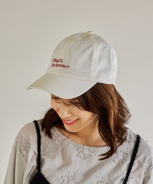 刺繍ロゴと明るいカラーリングが魅力!ーーー【素材】柔らかいコットン素材を使用。【デザイン】フロントに英語のメッセージロゴ刺繍が入った、カジュアルでキュートなキャップです。暗くなりがちな冬のコーディネートにワンポイントになる明るいカラー展開。シンプルなデザインで、日よけ対策やコーディネートのアクセントとして、幅広いシーズンで活躍します。ーーー【スタイリング】ざっくりとしたニットや、ボリュームのあるワイドパンツなど、カジュアルなアイテムとの相性◎。ワンピースの外しとして使えば、甘すぎない大人カジュアルスタイルが完成します。
