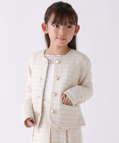ーーー◆デザイン大人っぽいノーカラージャケット。ショート丈でスタイルアップ間違いなしのアイテム。ツイード×ホワイト、ツイード×ブラック、ネイビーの3色展開。存在感のあるゴールドのハートボタンが高級感抜群です。フラップ部分はレースがついていてCUTE。バックネック部分には10C REPIPIのロゴ入りプレート付きで後ろから見てもカワイイデザイン。◆素材無地見えもするツイード生地。無地のネイビーは素材が柔らかく収縮性のある生地。ーーー◆スタイリング同素材のプリーツスカートとのSETUPスタイルがオススメ。セレモニーアイテムのリボンブラウスの襟を出したコーデも◎どんなボトムスにも合わせやすい丈感で、普段使いもできます。デニムパンツ×ローファーの大人っぽコーデやプリーツスカート×ハイソックスで制服風コーデも王道カワイイ。セレモニーだけでなく、結婚式や発表会、お出かけ、お呼ばれ、パーティーなど様々なオケージョンで活躍できるラインとして考えて作ったアイテム。卒園式や入学式だけでなく普段使いもしていただけます。お手持ちのワードローブでも是非コーディネートを楽しんでね。☆お名前タグ付きお下がりやお譲りなどで長く着用いただけるよう切り取り線付きのデザインにしております。120cm130cm※屋外の光や照明の当たり具合で、実際の商品の色味とカラー別画像の色味に違いが発生する場合がございます。 商品の色味はスタジオ撮影の詳細画像にてご確認ください。なお、商品の色や質感を出来るだけ忠実に再現するよう心掛けておりますが、パソコンなどの環境により実物と若干異なる場合がございます。▶▶INFORMATION◀◀■商品のお気に入り登録(♡マークをクリック!)完売カラーの再入荷通知やお得なタイムセール通知などを受け取ることができます♪■ブランドのお気に入り登録新商品や再入荷など、ブランドからのおトクな情報を受け取ることができます♪あわせてぜひご登録ください!【SNSも発信中!!】新作アイテムやアイテムリールを投稿しております。フォローして最新情報をチェックしてね!Instagram⇒@10crepipi_repipiarmarioTikTok⇒@10crepipi_repipiarmario【キーワード】キッズ小学生お出かけギャルストリート