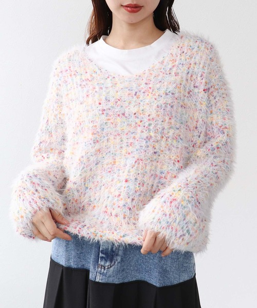 ■商品詳細 ポコポコとカラフルな配色が可愛いニットプルオーバー。 程よいボリューム袖で女性らしいシルエットを演出します。 やや短めの丈感でスタイルアップ効果もあり、 アウトスタイルでもサマになる1着です。 デコルテラインがスッキリ見えるVネックデザインで、 そのまま着るのはもちろん、ロンTとのレイヤードも◎ -------------------------------------- 透け感:なし 裏地:なし 伸縮性:あり ケア方法:ドライクリーニング ※お洗濯の際は洗濯表示を必ずご確認ください。 -------------------------------------- <コーディネートmodel160cm> <詳細画像model167cm>