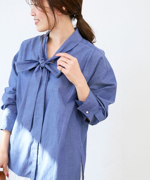 ボウタイリボンでフェミニンさをプラスできるダンガリーシャツ。●ポイント薄手で柔らかい綿混のダンガリー素材を使用。ポリエステル混なので、シワになりづらいのが魅力。取り外し可能なボウタイ付きで、フェミニンにもシンプルにも着回せる3WAYデザイン。1:ボウタイを付けた状態2:ボウタイを取り外した状態3:ボウタイをウエストのループに通してベルトとして着用した状態身頃や腕周りはゆったりオーバーサイズで余裕のあるシルエット。●おすすめコーデ前ボタンを開けて、羽織りとしてもトップスとしても使えてスカート・パンツ・ワンピースなど幅広く着まわせます。色展開は程よくカジュアルで、日常使いしやすい#ネイビーとネイビーよりきれいめ寄りで、ジャケットやスラックスなどとの相性が良く、ダンガリーなので黒でも重く見えない素材感の#ブラックの2色展開です。※取り扱いについては、商品についている洗濯表示にてご確認下さい。※照明の関係により、実際よりも色味が違って見える場合がありますまたパソコン・スマートフォンなどの環境により、若干製品と画像のカラーが異なる場合もございます。※商品の色味は、商品アップ画像をご参照ください。【注意事項】・画像の商品はサンプルです。・サイズ表記はあくまで目安となります。実際の商品と仕様、加工が若干異なる場合があります。