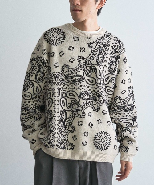 *上品さとこなれ感を同時に叶える、大人のための冬ニット 「5Gのダブルジャカードで、見た目以上に暖かい」 5Gのダブルジャカードで編み上げたしっかりとした厚みが、目の詰まった温もりをプラスしてくれます。 ポリエステル、アクリル、ナイロン、レーヨンをブレンドした生地を採用し、程よいハリ感と柔らかさを両立。 ちょうどいい肉感と立体感で防寒性に優れつつ、ご家庭で洗えるイージーケア仕様なのも嬉しいポイント。 「大胆に施したペイズリー柄が醸す上品さ」 大胆なペイズリー柄は、遠目にはシックなムードを演出するため、大人っぽく着られるのが特徴。 ゆったりとしたサイズ感とドロップショルダーで、 リラックスしたシルエットを作りながらも、ネック・袖口・裾のリブが全体を引き締めてくれます。 ベーシックな3色展開で幅広い着こなしに馴染んでくれます。 「着るだけでコーデが決まる、冬の主役ニット」 シャツの襟を覗かせて、スラックスと革靴で合わせれば、大人のきれいめカジュアルスタイルに。 デニムとスニーカーでラフにまとめれば休日のこなれた装いに。 ニットの柄を活かすために、ボトムはシンプルなデザインで合わせ、バランスを取るのがおすすめです。 透け感[なし] 生地の厚さ[普通] 光沢感[なし] 伸縮性[あり] 裏地[なし] ポケット[なし] ※モデル着用画像は、光の当たり具合で色味が違って見える場合がございます。 ※お使いのモニター環境によって商品の色味が違って見える場合がございます。  ̄ ̄ ̄ ̄ ̄ ̄ ̄ ̄ ̄ ̄ ̄ ̄ ̄ ̄ ̄ ̄ ̄ ̄ ̄ ▼商品のお気に入り登録がおすすめです ▼ 商品ページ内のハートマークをクリック。完売時の再入荷や、最後の1点の通知、最後の1点など、お得なお値下げ情報を受けとる事ができます。 【お知らせ】ページでも通知が確認できます。  ̄ ̄ ̄ ̄ ̄ ̄ ̄ ̄ ̄ ̄ ̄ ̄ ̄ ̄ ̄ ̄ ̄ ̄ ̄