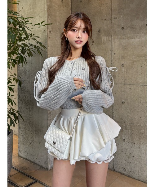【冬コーデの味方♡ワンセットで無敵に可愛い!主役ニットセット】【Design】太めのリブ編みで仕上げた、キャミソール×ショートカーディガンのセットアイテム。カーディガンは肩部分が大胆にカットされたショルダースリットデザインで、結ぶだけで可愛さが引き立つリボンディテールがアクセントに♡胸元にはさりげないロゴ刺繍があしらわれ、シンプルながらもこなれ感のある仕上がりに◎コンパクトなショートカーデとフィット感のあるリブキャミのバランスが絶妙で、自然とスタイルアップを叶えてくれます。【Styling】セットで着るだけで旬のレイヤードコーデが完成!デニムでカジュアルに、ミニスカートでガーリーに、ショートパンツと合わせればヘルシーな肌見せで、抜け感のあるスタイリングなど、幅広いテイストにマッチします♡カーデだけ・キャミだけでも使えるので、着回し力も抜群!【Fabric】柔らかく伸縮性のあるリブニット素材を使用し、着心地の良さも魅力。優しい雰囲気のアイボリー・冬の空気をまとったようなサックス・上品で落ち着いた印象のグレー・シックで大人っぽいブラックの4色展開。