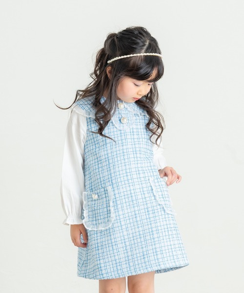 特別な日を彩る主役級ワンピース! ツイード風のチェック柄に、大きな丸襟とフリルポケットをあしらったとことんガーリーなデザインです♪パール調のボタンも上品で、着るだけでお嬢様スタイルが完成します。 ブラウスがドッキングされているようなデザインで、これ一枚でコーディネートが完成するのも嬉しいポイント◎ 【おすすめのコーディネート】 迷ったらこれ!インナーの白シャツと合わせて、白やアイボリーのタイツ・靴下を合わせると、王道の愛されセレモニースタイルに。ヘアアクセサリーにパールやお花を使うと華やかさがグッとアップし、記念写真にも美しく映えます♪ベレー帽などトラッドな小物をプラスすれば、卒園式やちょっとした発表会にもぴれったりな洗練されたスタイルに格上げされます◎ 卒園・入学式や七五三、結婚式のお呼ばれなど、特別なハレの日に大活躍するマストバイアイテムです! *DILのベビーサイズ商品は、全てホルマリン含有率の検査を通っておりますのでご安心下さい。 la poche biscuit(ラ・ポシェ・ビスキュイ)は、ナチュラルテイストに可愛いモチーフと、さりげなくトレンドを取り入れ、女の子に寄り添うワードローブを提案するブランド。 心躍る華やかなコーディネートが毎日をハッピーに彩ります。