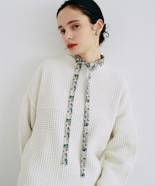 暖かさと爽やかさを兼ね備えた万能デザインニット冬の最後の買い足しアイテムにおすすめの、片畦とボーダー編地を組み合わせたデザインニット。片畦編みの程よい肉感が暖かな印象。そこにボーダー柄の編み柄をプラスしてポイントに。ボトルネックの襟元やワイドなシルエットで1枚でサマになるデザイン。少しだけ春の雰囲気を取り入れられる爽やかなカラーを4色揃えました。コーディネート【アウター】ロングコートやショートダウンを羽織って冬らしいあたたかコーデに。明るいカラーを選べば、早春に向けた軽やかさも演出できます。【ニット】インナーに薄手のタートルを重ねると、より暖かくレイヤードスタイルを楽しめます。ボトルネックとの組み合わせも◎【スカート】タイトスカートで大人っぽく、プリーツやフレアスカートで軽やかに。ワイドシルエットのトップスがバランスよく映えます。※照明の関係により、屋外で撮影した写真の商品は、実際よりも色味が違って見える場合があります。またパソコン・スマートフォンなどの環境により、若干製品と画像のカラーが異なる場合もございます。予めご了承ください。実際の商品の色味は、スタジオ撮影の画像をご参照下さい。※商品画像はサンプルのため、色味やサイズ等の仕様に変更がある場合がございますので、予めご了承ください。アイテム詳細素材:アクリル40%,ウール30%,ナイロン30%サイズ: 【F】 着丈:56/62cm,身巾:58cm,肩巾:58cm,衿巾:4.5㎝,袖巾:20.5cm,袖丈:45cm,裾巾:58cm====================裏地:なし透け感:なし生地の伸び:あり====================生産国:中国品番:12545007※取り扱い・ケア方法については、商品についている品質表示でご確認ください。