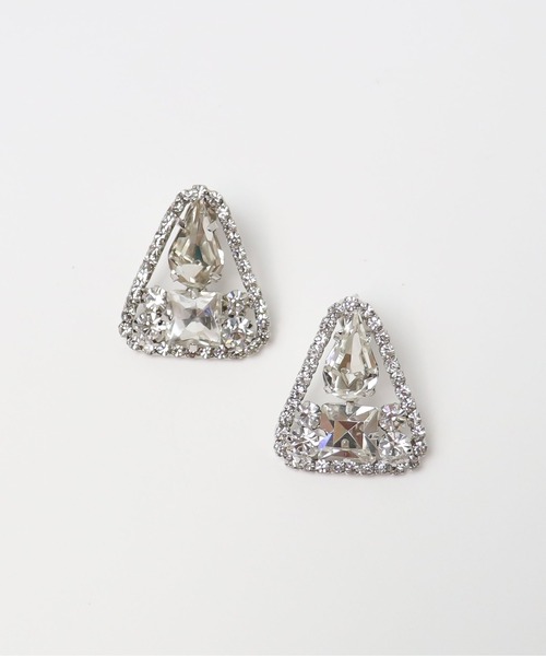 三角形のフレームの中に丸や四角いビジューがセットされた幾何学的モチーフピアス。程良いボリューム感でカジュアルにもパーティーシーンにもオススメです。お誕生日、記念日といったお祝いにはもちろんのこと、母の日、クリスマス、ホワイトデーなどのプレゼントにもおすすめです♪※モニターの明るさなどによって実際の色と差が出る事があります。◆インフォメーション◆・ショップのお気に入り登録お得情報を受取ることができます♪ぜひご登録ください♪・商品のお気に入り登録再入荷通知を受け取ることができます☆ぜひご登録ください☆