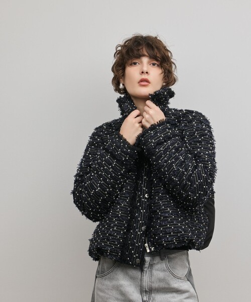 カジュアルになりがちなダウンジャケットを大人可愛くアップデートした、主役級の存在感を放つ一着。 シーズンスタイルを盛り上げてくれる、一際目を惹く表情豊かなドットツイード素材を使用。 体を優しく包み込んでくれる丸みのあるシルエットやバックスタイルの無地の切り替えなど、細かなディティールまで拘りました。 大きめな衿と少し長めの華やかなフリンジデザインもポイント。 ダウン90%・フェザー10%の黄金比率で、 非常に暖かくて軽い、頼れる実力派デザイン。 この冬を上品に彩る、本命として手に入れたいダウンです。 ※こちらのモデル着用画像はサンプル品を撮影しております。実際の商品と仕様、加工、サイズが若干異なる場合がございます。予めご了承くださいませ。 洗濯表示 洗濯不可 漂白不可 タンブル乾燥不可 アイロンは120℃まで 弱いドライクリーニング(石油系)可