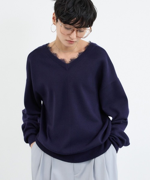 女性らしさを際立たせる、繊細なレース付きニット・ネックラインに沿ってラッセルレースを縫い付けたフェミニンなニット。・後ろを前にしてVネックプルオーバーとしても着られる2WAY仕様です。・身幅やアームホールにゆとりを持たせたリラックス感のあるシルエットが、大人の余裕を感じさせます。・体のラインを拾わない生地感で、気軽に着やすい1枚です。【スタイリング】きれいめのボトムスと合わせたフェミニンなスタイリングはもちろん、カジュアルダウンしたい方はデニムやワイドパンツ合わせがおすすめ。シンプルなコーディネートでもレースがワンポイントになってくれます。【素材】お手入れ方法:クリーニングウール混で保温性に優れながらも軽やかな着心地で真冬、春先までロングシーズン活躍します。カジュアルになりすぎない、品のある表面感も特徴です。---------------------------------透け感:透けない伸縮性:あり生地の厚さ:普通裏地:なし※こちらは参考情報となります。カラーにより多少の誤差がございます。※ライトグレーで計測しています。---------------------------------【原産国】中国お買い物をお得にもっと楽しく!上手な活用方法>>>▼商品のお気に入り登録▼完売カラーの再入荷通知や、ラスト1点の通知、プライスダウンしたセール通知も受け取ることができます。▼ブランドのお気に入り登録▼新作や再入荷等、いち早くブランドのお得な情報を受け取ることができます。【ご注意】※屋外の光や照明の当たり具合で、実際の商品の色味とカラー別画像の色味に若干の違いが発生する場合がございます。 詳細画像と併せてご確認の上、ご注文いただきますようお願い致します。※サンプルにて撮影をしておりますので、 実際の商品とは色味・仕様や加工・サイズ等が若干異なる場合がございます。 予めご了承くださいませ。