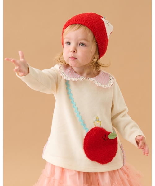 りんごのポシェットを肩にかけたような見せかけデザインのトレーナーです。 大きめの衿や、さまざまな素材を組み合わせたクラフト感がポイント。 ポシェット部分はポケットになっており、ハンカチなどの小物を入れられます。 後ろ衿ぐりはお着替えしやすいゴム仕様です。 内側にお名前を記入できるタグつき。 【透け感】透けない 【生地の厚さ】普通 【伸縮性】あり 【裏地】なし 【ポケット】あり 【アジャスター】なし