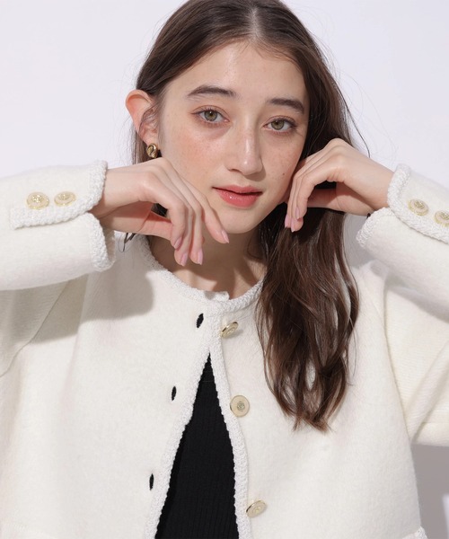 上品な質感のニットをジャケット風に仕立てた一枚。フラップポケットやゴールド調ボタンがさりげない華やぎを添え、品よく着映えします。ワンピースに羽織って女性らしく、デニム合わせで大人カジュアルにも。軽い着心地で長い季節活躍し、コーデを上品にまとめてくれる万能アウターです。【ご注意】※撮影照明の関係により、実際の商品と色味が異なって見える場合がございます。また、パソコン・スマートフォンなどの環境により、製品と画像のカラーが異なる場合もございます。予めご了承ください。※商品画像はサンプルのため、色味やサイズ等の仕様に変更がある場合がございますので、予めご了承ください。