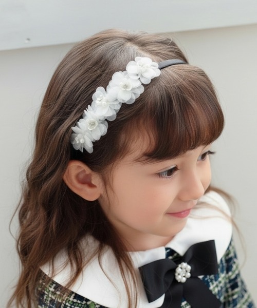 ■商品説明まるで雪の妖精が舞い降りたよう…Roraの「スノーフラワーカチューシャ」は、お子様の魅力を最大限に引き出す、とっておきのヘアアクセサリーです。繊細なオーガンジー素材で作られた花びらは、光を優しく透過し、まるで本物の雪の結晶のような透明感と軽やかさを演出します。花の中心には、きらめくカットビーズとラインストーン、そして上品なパールがあしらわれ、小さくても存在感のある輝きを放ちます。ホワイトのカラーは、どんなお洋服にも合わせやすく、発表会やお誕生日、卒園式や入学式、結婚式など、様々なフォーマルシーンや特別な日を一層華やかに彩ります。もちろん、ちょっとしたお出かけにもぴったり。軽量でつけ心地も良く、細い髪のお子様でも快適にご着用いただけます。可憐で上品なデザインで、お子様の可愛らしさをぐっと引き立ててくれることでしょう。■サイズフラワーモチーフ:縦3.5cm 横3.5cmカチューシャ幅:約0.7cm