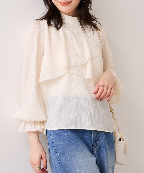 【2025 Autumn/Winter】【25AW】 【2026 Spring】【26SS】<POINT>・キレイ目にもカジュアルにもボトムを変えるだけでコーディネートが変化するブラウスです!【デザイン・シルエット】アシンメトリーなティアードがデザインポイントの華やかでフェミニンなブラウス!スタンドカラーと胸元のティアード、デザインがジャケットインにとてもマッチする1着です。また、袖口シャーリングフリルは、カーディガンを羽織って袖口からの出してレイヤードするもの◎!春先の暖かくなってきたときに、たくし上げて袖丈の長さが調整できるのも嬉しいポイント!【素材】さりげない凹凸感のある変型楊柳の着心地の良い素材です。【カラー】チャコール、オフ白、エクリュの3色展開です。【おすすめのスタイリング】春のオケージョンシーズン、ジャケット×パンツのセットアップのインナーにきれい目コーディネートはもちろんおススメですが、スエードジャケット、またはカーディガン×デニムパンツなどでカジュアルスタイリングも◎!-----------------------------裏地:なし光沢感:ややあり透け感:あり、なし伸縮性:ややありボタン:後ろにあり(開閉可)生地の厚さ:やや薄手季節:春、夏、秋-----------------------------【モデル着用サイズ】身長:161cm 着用サイズ:F※画像の商品はサンプルです。実際の商品と仕様、加工、サイズが若干異なる場合がございます。※画像によっては実際の色味と異なる場合があります。正しい色味は生地アップ画像をご確認ください。