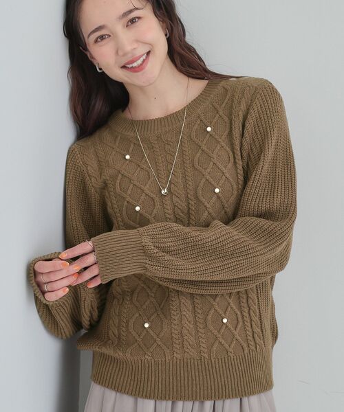 【デザイン】 ざっくりたケーブル編みににフェイクパールをあしらったニット。 ややつまり気味のクルーネックで寒い時期にぴったり。 身頃とお袖部分の編地変化もポイントになっています。 程よくふんわりしたフォルムで女性らしく上品な1枚です。 【スタイリング】 裾部分はリブ使用なので、インせずにスタイリングが決まります。 パンツにもスカートにも合わせやすく、着こなしの幅が広がります。 テーパードやワイドパンツを合わせていいただくと、オフィスカジュアルにも。 ナロースカートやフレアスカートを合わせると、上品な印象に。 デニムを合わせれば、大人の上品なカジュアルスタイルに。 【素材】 やわらかなタッチの糸を使用しています。 ※照明の関係により、実際よりも色味が違って見える場合があります。また、パソコン・スマートフォンなどの環境により、若干製品と画像のカラーが異なる場合もございます。 モデル情報:身長163cm B81 W59 H88 着用サイズ:02(M) 店舗へのお問い合わせ商品番号:741-14043 ●製品寸法: 01(S):着丈52cm B92cm 袖丈55cm 肩幅35cm 02(M):着丈53cm B95cm 袖丈55cm 肩幅35cm 03(L):着丈54cm B98cm 袖丈56cm 肩幅36cm 04(LL):着丈56cm B102cm 袖丈56cm 肩幅36cm 備考: