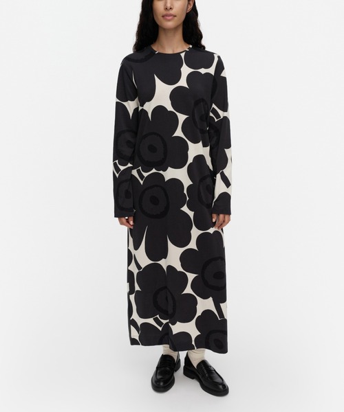 【テキスタイルデザイン:Maija Isola(マイヤ・イソラ)】 Unikko(ウニッコ):花 Unikko柄モチーフが全体にプリントされたロング丈ワンピース。スリムかつストレートなフィット感で、すっきりとした印象のシルエットを演出します。後ろ裾の大きなスリットがスタイリッシュなデザインポイント。便利なサイドシームポケット付き。一枚で華やかなお出かけコーディネートが完成するアイテムです。 ※品質表示は、Marimekko社の付けた洗濯表示を日本国内の基準に合わせ付け替えております。本国のタグはカットされておりますので、予めご了承ください。 ※断裁により商品ひとつずつの柄の出かたが異なるため、表示画像のディテールと多少異なるデザインのものが届く場合がございます。予めご了承ください。 モデル着用サイズ:M/038/004