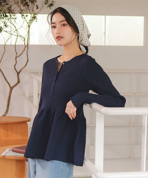 titivateで人気のペプラムデザインに、カジュアルさをプラスしたヘンリーネックバージョンが登場。前後どちらでも着られる2way仕様で、着こなしの幅が広がる一枚です。 ■Point ・前後2wayでアレンジ自由:前後どちらでも着られる仕様で、シーンや気分に合わせてスタイルチェンジ可能。 ・ヘンリーネックで大人カジュアル:すっきり開いたネックラインが抜け感を演出し、女性らしさを引き立てる。 ・ふんわりペプラムシルエット:腰回りをカバーしつつ、コンパクトな上身頃とのメリハリで華奢見え。 ・さりげない釦アクセント:シンプルながら表情豊かで、着映え感をプラス。 ・程よい厚みのリブニット:着心地も抜群で、デイリーからお出かけまで活躍。 ■Coordinate ・パンツでスマートカジュアル:スリムパンツやワイドパンツと合わせて、こなれた大人カジュアルに。 ・スカートでフェミニンスタイル:タイトスカートやフレアスカートと合わせると、女性らしい華やぎコーデに。 ・重ね着もOK:シャツやカットソーとのレイヤードで奥行きのあるスタイルも楽しめます。 ・豊富なカラー展開:ベーシックからトレンドカラーまで揃い、着回し力抜群。 前後2way仕様×ペプラムシルエットで、女性らしさとカジュアル感を両立した万能ニットトップスです。 ※この製品は素材の特性上引っ掛けが生じやすい面があります。表面の粗い物に擦ったり、バッグやベルト、先の鋭い物にひっかけますとささくれや糸が浮き易く、切れる事もあります。着用、着脱の際はベルト、バッグ、アクセサリー等の金具や突起物にご注意下さい。 ※当商品は機械による生産の過程上、どうしても"生地を織る際の糸の継ぎ目"や多少の"ほつれ"、他繊維の"混紡"、また、形やサイズや柄に多少の"誤差"が生じる場合がございます。 ※サイズは、実寸サイズを測っているため多少誤差がでる場合があります。製造工程の関係上、各採寸箇所実寸(平置き)より【約-3cm~+3cm】程度は誤差の許容範囲とさせて頂いておりますので、予めご了承くださいませ。 ※メーカーより密封状態で入庫し、検品時に再度袋詰めを行っておりますが、素材により染料等の臭いが強い場合がございます。 ※発送上の状態によって商品がシワになる場合がございます。 ※商品により色落ち・色移りがある場合がございますので、品質表示をご確認の上、お取り扱いにご注意くださいませ。 【伸縮性】あり 【透け感】淡色にあり