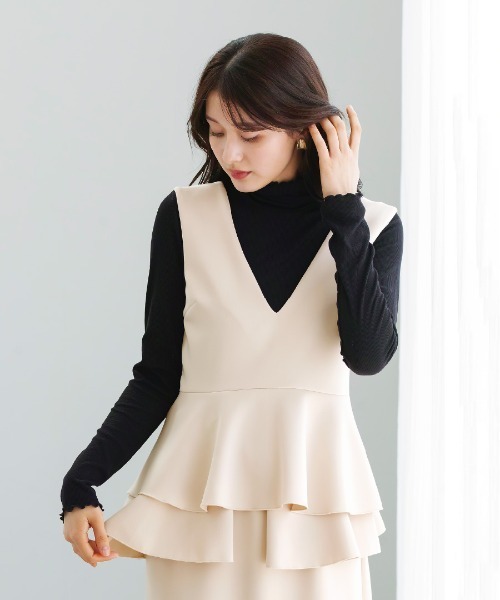 【 リラクシーに映える 】 ハイストレッチライトポンチ・バックレースアップペプラムブラウス■ White Collection ■「 バックコンシャスな レースアップブラウス 」しなやかなハリ感と快適な着心地を叶えるハイストレッチライトポンチを使用したノースリーブブラウスです。みぞおち深Vネックがレイヤードスタイルに抜け感を持たせ高すぎず、低すぎないウエスト切替え位置と緩やかに波打つペプラムがお腹やヒップをやさしくカバー。背中にはグログランテープを使用したレースアップを施し後ろ姿まで印象的に仕上げました。上品な艶感とストレッチ性を兼ね備えた多機能素材でデイリーにもオフィスにもなじむ、程よいつや感で大活躍。同シリーズのペプラムデザインスカートと合わせればティアードデザインのような華やかなセットアップスタイルが完成しデイリーからオフィス、セレモニーまで幅広く活躍します。ジャケットのインにも、一枚での着用にも映える洗練されたデザインブラウスです。〈〈 ハイストレッチライトポンチ シリーズ 〉〉しなやかな伸縮性とリラクシーな着心地。ほんのりとした光沢感で、上品に見える素材感。“ 嬉しい多機能素材 ”●ホームケア… おうち洗いできるイージーケア●UVカット … 紫外線遮蔽率99%以上●ストレッチ…全方位ストレッチ●軽量…軽やかな着心地でストレスフリー●マルチシーズン…晩夏から春まで着られる〈 3 item 〉●バックレースアップペプラムブラウス/品番:776011●ペプラムレイヤードストレートスカート/品番:776012●ウエストベルトデザインバレルレッグパンツ/品番:776013【 color 】●エクリュ●ネイビー●ブラック===================厚さ:★★★☆☆ 透け感:なし裏地:なし伸縮性:ありケア:手洗い可シーズン:春・秋・冬===================【 fabric 】ポリエステル87% ポリウレタン13%【 model 】SAKURA 169cm S着用MADE IN CHINA(企画・検品は日本)バックコンシャス Vネック ペプラム ノースリーブ レースアップ ハイストレッチ ダンボールニット 上品 多機能 シワになりにくい デイリー オフィス セレモニー レディース 洗練 きれいめ 上半身細見え