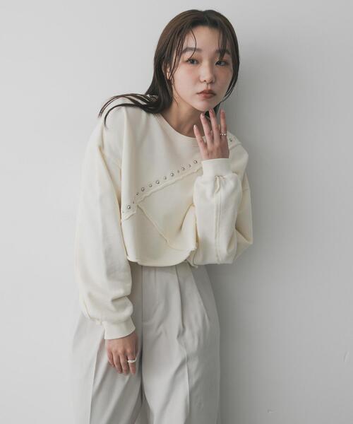 【モードなエッジ。切り替えデザインの主役級トップス】 ・ピグメント染めを施した、味のあるフェードカラーのカットソー素材 ・トレンドのスタッズを切り替え部分に大胆に施したデザイン ・コンパクトなクロップド丈で、スタイルアップ効果も抜群 ピグメント染め特有の味のあるフェードカラーが魅力のカットソー(スウェット)プルオーバー。トレンドのスタッズをアシンメトリーな切り替えラインに沿って大胆に配置し、エッジの効いたデザインに仕上げました。コンパクトなクロップド丈なので、ハイウエストのボトムスと合わせるだけでスタイルアップが叶います。 【2026 Spring/Summer】【26SS】 ※この商品は、摩擦や汗、雨などの使用条件等により、色落ちや他の物への色移りの可能性がございますのでご注意ください。スタッズ(鋲)やファスナー、ボタンなどの装飾部品を使用しています。着用の際、引っ掛けたり、強い力が加わると取れることがあります。 ※その他お取り扱いに関しましては、商品に付属のアテンションタグをご覧ください。 ※商品画像は、光の当たり具合やパソコンなどの閲覧環境により、実際の色味と異なって見える場合がございます。予めご了承ください。 ※商品の色味の目安は、商品単体の画像をご参照ください。 ▼お気に入り登録のおすすめ▼ お気に入り登録された商品は、マイページにて現在の価格情報や在庫状況の確認が可能です。 お買い物リストの管理にぜひご利用ください。 素材感 透け感 : ややあり(IVORY) 伸縮性 : ややあり 裏地 : なし 光沢 : なし ポケット : なし one