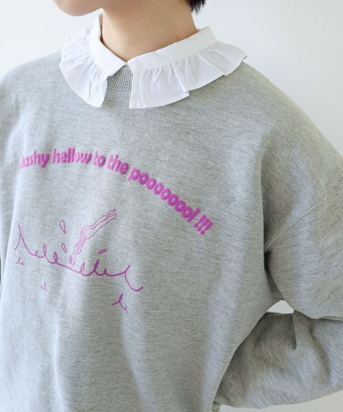 プールに飛び込む姿がユニークなスウェットプルオーバー。デザイナーが手書きした図案を、立体感のあるフロッキープリントで表現しました。“プールに挨拶する”というユニークなワードに遊び心を感じます。着映えする配色のかけ合わせでスタイリングの主役にぴったりの一枚。ブルーとイエローにはフロスト加工を施し、洗いざらしたような風合いを出しました。丈夫で厚みのある綿素材で暖かく、お手入れが簡単なところも嬉しい。シャツやタートルネックのトップスに重ねられるゆったりとしたサイジングで、インナーを変えて様々な着こなしをお楽しみいただけます。カジュアルにデニムやカーゴパンツと合わせたり、レースやプリーツなど甘めのスカートとも相性抜群です。※ブルーとイエローはフロスト加工を施している為、若干の個体差があり、グレーより大きめのサイズとなります。詳細は各カラーのスペックをご覧下さい。--------------------透け感:なし裏地:なし伸縮性:あり光沢感:なしポケット:なし--------------------【素材の特性・お取り扱いの注意】・取り扱いの注意については取り扱い表示をよくご確認の上、着用をお願い致します。・着用や洗濯を繰り返すことにより、プリント部分にひび割れや剥離が生じる事があります。・プリント部分への過度な摩擦はお避け下さい。一度汚れが付くと取れにくいので汚さない様にして下さい。・必ず裏返して洗って下さい。※撮影画像は、光の当たり具合やモニターの環境により色味が違って見える場合があります。あらかじめご了承下さい。※画像はサンプルを着用しています。お届けする実際の商品と仕様、加工、サイズが若干異なる場合があります。イエローのサンプルの画像から身幅が一周で4cm大きくなります。