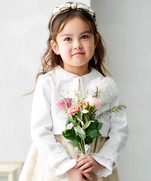 -26SS- 丸みのあるボレロ丈がワンピースと相性の良いノーカラージャケット。 ■デザイン やわらかく軽さのあるリップルポンチ素材で動きやすく着心地◎ 縁にラメ入りのブレードをあしらったラインで華やかさをプラスしました。 袖口の裏にレースを重ねることで袖を折り返して着ても可愛い仕様になっています。 カラーはフレッシュな印象のホワイトとネイビーの2色展開。 フォーマルシーンにぴったりなアウターです。 ■素材/機能 細かな畝が特徴的なリップルポンチ生地を使用。 柔らかい質感でしわになりにくくお子様にも窮屈感なく着ていただきやすい1着です。 裏地には軽い質感のコットンオーガンジーを使用しています。 26春夏アイテム 【2026年春 入学 卒園 COLLECTION】 入学式や卒園式など特別な日に彩りを添えるフォーマルアイテム。 フレッシャーズにぴったりな品の良さ・華やかさのあるアイテムを揃えました。 主役のこどもたちの自分らしさに寄り添うオケージョンコーディネートを見つけてください。 【BeBe(べべ)】 ”LOVE MODERN” 少しおませで、生意気なヨーロピアンカジュアルの提案。 時代性・流行性をとらえ、ベーシックでもワンポイントを施した遊び心、楽しさを盛り込んでいます。 シンプルだけど、こだわりのあるオリジナリティーを重視しています。