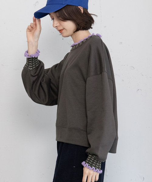 ■Point 衿と袖口にオリジナルで編み立てたニット付属をあしらったデザイントレーナー。さりげないジャカード柄と配色のフリルがポイントです。肩を落としたゆとりのあるシルエット。長すぎない着丈で、合わせるボトムを選ばずデイリーに活躍する一枚です。 -------------------- 透け感:なし 厚さ:普通 伸縮性:ややあり -------------------- ◆注意事項◆ 可能な限り実物に近いカラーにて掲載しておりますが、ご使用のパソコンやスマートフォンなどの端末の環境によって、実際の色味と異なって見える場合がございます。予めご了承ください。 サンプルで撮影している商品もございます。その場合、実際の商品とは色味・仕様が異なる場合がございますので、予めご了承ください。 POU DOU DOU プードゥドゥ ひと手間加えた存在感のある「日常着」 いつまでもときめきとかわいいを忘れない方への 愛着を持てるワードローブ = お気に入り登録がおすすめ!= お得な情報をいち早くお届け致します。 アイテムをお気に入り ⇒ SALE START / 完売COLOR再入荷 / LAST1点 etc... ブランドをお気に入り ⇒新商品 / 再入荷 /クーポン・セール情報 etc...
