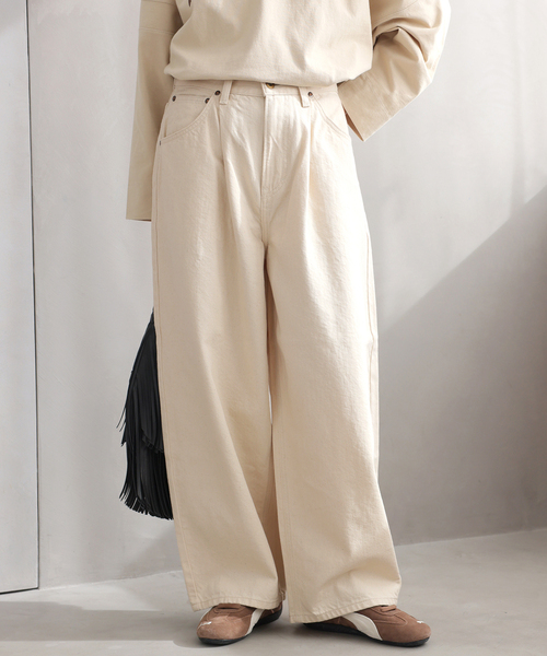 【2026SS】JOURNAL STANDARD relume◆イージーな履き心地が魅力のタックパンツゆったりとしたサイズ感ながら、タックがメリハリを演出してくれるデザイン。ベーシックなデニム生地と、軽やかなムードのナチュラルカラーの2色展開です。【Lee /リー】1911年に自社工場での本格的な生産を始め、 Levi'sやWranglerと並ぶ世界3大デニムブランド。ワークウエアからファッションアイテムとしての長い歴史があり、1976年アメリカ建国200年祭にともない、”Lee RIDERS”をはじめとする様々な”Lee”製品が日本にも紹介されると瞬く間に当時の若者の間で定番アイテムとなる。様々なモデルが日本企業によって復刻され、伝統を守りつつ最新のテクノロジーを導入し、新たな軌跡をジーンズ史に刻むブランドです。※素材についてカラーによって革ラベルの組成が異なります。アイボリー:合成皮革ネイビー:牛革※サイズについて弊社販売サイズ:メーカーサイズX-SMALL:XSSMALL:S※カラーについて弊社販売カラー:メーカーカラーアイボリー:124 OFF WHITEネイビー:100 ONE WASH※メーカー品番:LL1022※取り扱いについては、商品についている品質表示でご確認ください。**********************透け感:なし裏地:なし伸縮性:なし光沢感:なし生地の厚さ:普通**********************【スタッフ着用コメント】《スタッフM》年齢:30代/身長:160cm/体型:普通/普段サイズ:M/着用サイズ:X-SMALLサイズ感:ラインを拾わないゆったりしたデザインです。XSでもゆとりがありました。素材感:しっかりとしつつも柔らかな生地です。着心地:幅広のシルエットなので楽な履き心地です。**********************※照明の関係により、実際よりも色味が違って見える場合があります。またパソコン・スマートフォンなどの環境により、若干製品と画像のカラーが異なる場合もございます。※商品の色味は、商品アップ画像をご参照ください。本体:洗濯機洗い(弱)